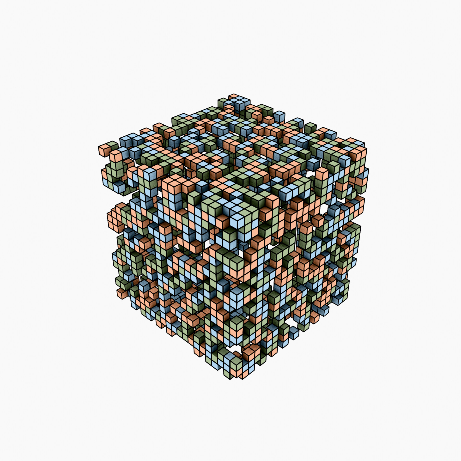 Cube Space is a procedural art series created entirely in Blender. Each piece explores volumetric complexity through thousands of individually generated cubes, where code defines placement, color, and material. This collection turns mathematical precision into visual rhythm — showing how rigid systems can create mesmerizing, chaotic beauty.